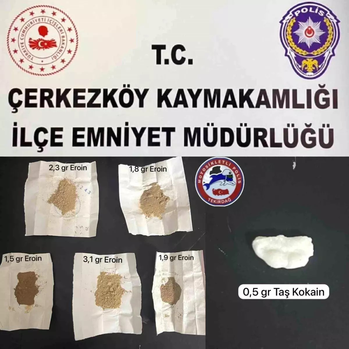 Çerkezköy Emniyet Müdürlüğü Narkotik Suçlarla Mücadele Şubesi ekiplerinin denetim ve operasyonlarda 10,6 gram eroin, 126 adet galara hap, 7 adet satışa hazır halde skunk, 3 adet lyrica hap, 20 adet farklı boyutlarda peçeteye emdirilmiş A-M maddesi, 5,72 gram esrar ve 0,5 gram taş kokain bulundu.