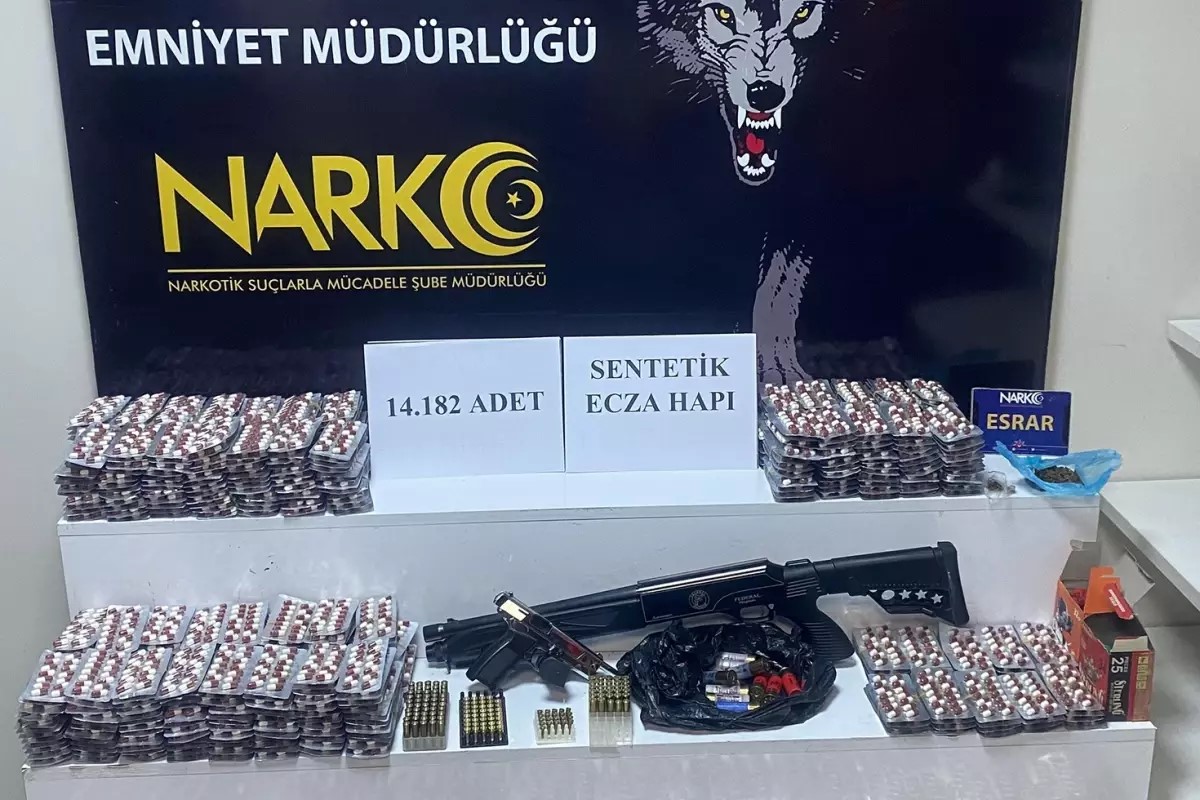 Adreslerde yapılan aramalarda; reçeteye tabi 14 bin 182 uyuşturucu hap, 10 gram esrar ile ruhsatsız tabanca, ruhsatsız av tüfeği ve çok sayıda mermi ele geçirdi. Gözaltına alınan B.Ö., emniyetteki sorgusunda, “Uyuşturucu satışı yapmıyorum. Evde bulunanları kullanmak için satın aldım” dedi. İşlemlerinin ardından adliyeye sevk edilen B.Ö., çıkarıldığı mahkemede tutuklandı.