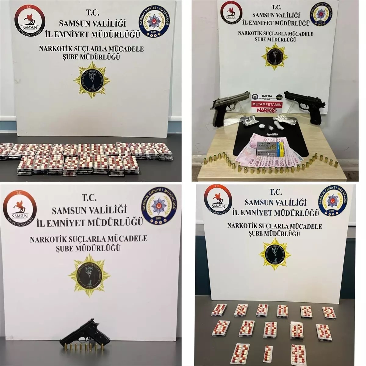 Adreslerdeki aramada, 1540 uyuşturucu hap, 25,63 gram sentetik uyuşturucu, 3,84 gram esrar, hassas terazi, 2 uyuşturucu kullanım aparatı, 2 kurusıkı tabanca, ruhsatsız tabanca, 86 kurusıkı tabanca fişeği, 7 tabanca fişeği ile uyuşturucu ticaretinden elde edildiği değerlendirilen bir miktar para ele geçirildi.